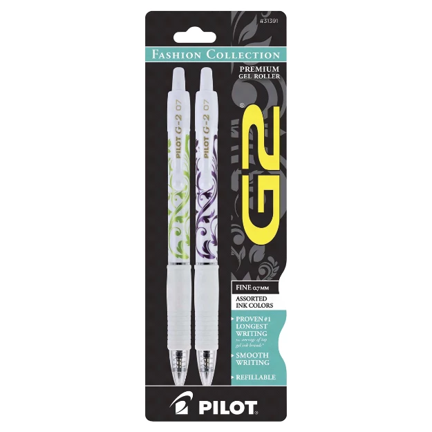 Pilot G2 Fashion White Collection Premium Retractable Gel Ink Rolling Ball Pen, Fine Point, Barrel Accent And Ink Color May Vary, 2/Pack